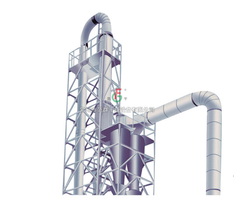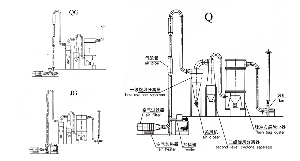 濕物料經輸送機與加熱后的自然空氣同時進入干燥器,二者充分混和,由于熱質交換面積大,從而在很短的時間內達到蒸發(fā)干燥的目的。干燥后的成品從旋風分離器排出,一小部飛粉由旋風除塵器或布袋除塵器得到回收利用。Q型氣流干燥器是負壓操作,物料不經過風機;QG型氣流干燥器是正壓操作;物料經過風機帶有粉碎作用;FG型氣流干燥器是尾氣循環(huán)型;JG型氣流干燥器是強化型氣流干燥器,其集閃蒸干燥與氣流干燥為一體,是我公司根據(jù)用戶要求設計的新型干燥設備。