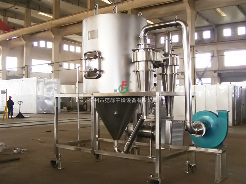 空氣通過(guò)加熱器轉(zhuǎn)化為熱空氣,進(jìn)入裝置在干燥室頂部的熱風(fēng)分配器,然后均勻的進(jìn)入干燥室,同時(shí)通過(guò)無(wú)級(jí)調(diào)速的螺桿泵將料液送至裝置在干燥室頂部的離心霧化器,使料液霧化成極小的霧化液滴,料液和熱空氣并流接觸,水份迅速蒸發(fā)在極短的時(shí)間內(nèi)干燥為成品,成品經(jīng)干燥塔底部和旋風(fēng)分離器排出,廢氣由風(fēng)機(jī)抽出排空。