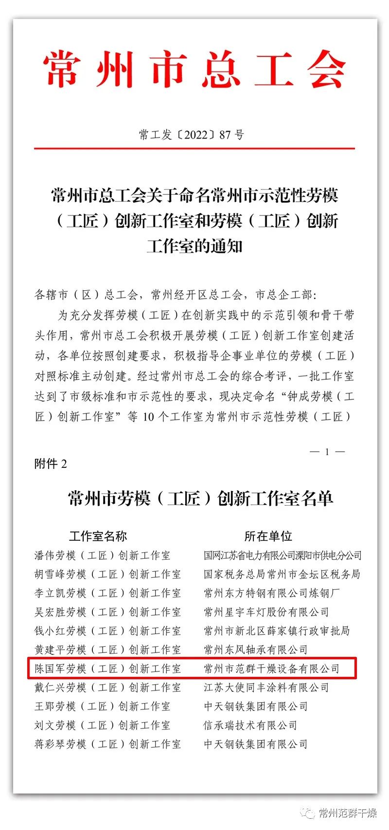 日前,常州市總工會公布17個常州市勞模(工匠)創(chuàng)新工作室名單,常州市范群干燥設(shè)備有限公司“陳國軍勞模(工匠)創(chuàng)新工作室”榜上有名。