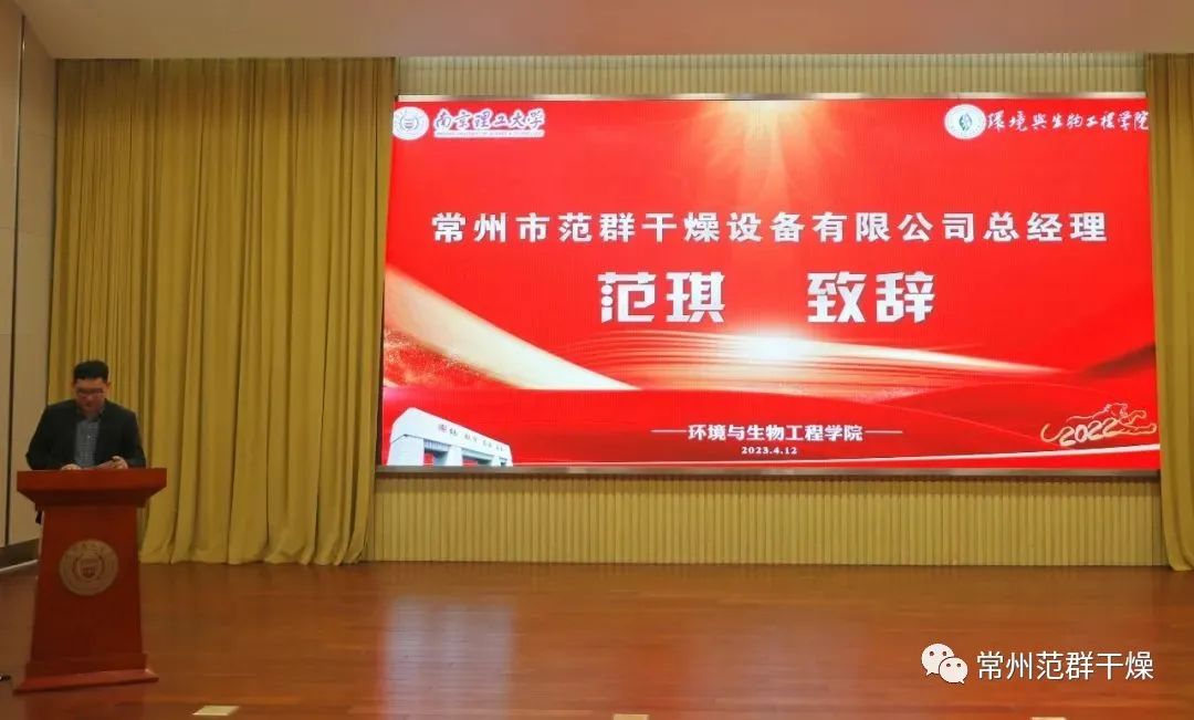 4月12日下午, 南京理工大學(xué)環(huán)生學(xué)院環(huán)境與生物工程學(xué)院舉行2022年度社會獎學(xué)金頒獎典禮暨優(yōu)秀學(xué)生報告會。南京理工大學(xué)博士研究生、常州市范群干燥設(shè)備有限公司總經(jīng)理、江蘇南理范群裝備科技有限公司總經(jīng)理范琪博士應(yīng)邀出席并作為企業(yè)代表發(fā)言。