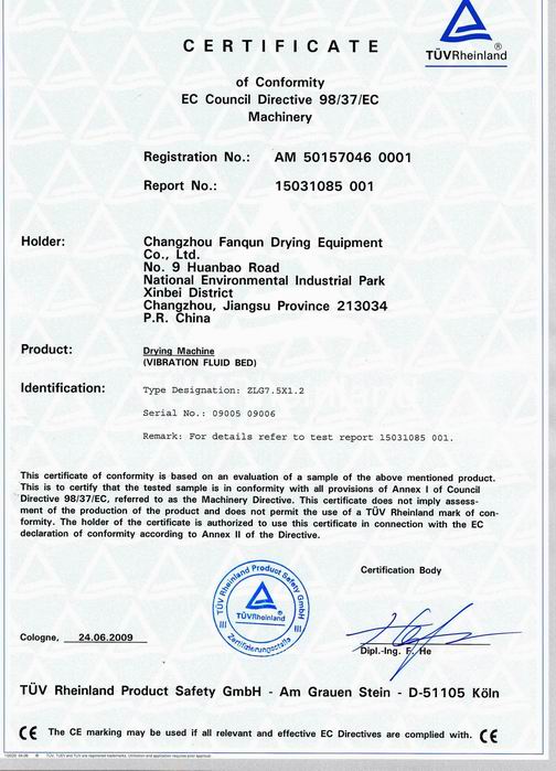 2009年6月底,經(jīng)公司領(lǐng)導(dǎo)和員工的全體努力,公司產(chǎn)品流化床順利通過CE認證,有力推動我公司產(chǎn)品出口歐洲,加快走向國際市場的步伐。